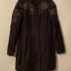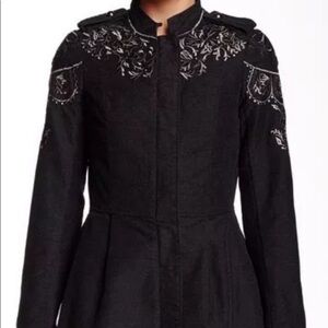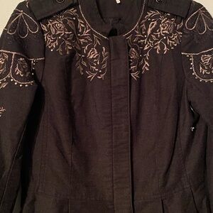 Elegant black jacket with intricate white embroidery. Long sleeves and structured fit. Perfect for stylish layering.