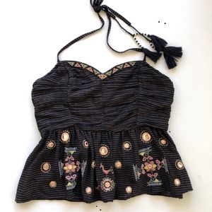 Chic black tank top with intricate embroidery. Features a flattering halter neckline. Perfect for casual outings.