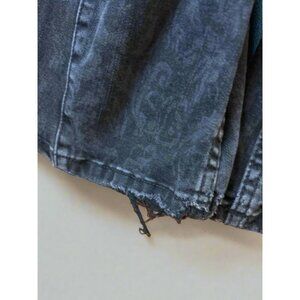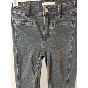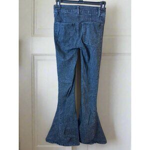 Turn heads in these vintage-inspired Free People black flared jeans. Designed with a flattering fitted leg that kicks out into a dramatic flare, these jeans bring retro style into modern wear. The subtle tonal pattern and flat front pockets add unique detail, making them a standout piece in any wardrobe. Perfect for pairing with a cropped top, chunky sweater, or boho blouse. A timeless Free People statement piece. Size: 25” waist- Inseam: 30” - Very good pre-owned condition – note minor fraying/distressing at hem (see photo), which adds to the vintage boho look