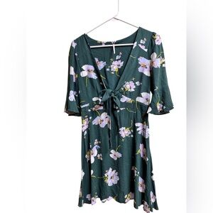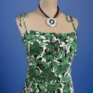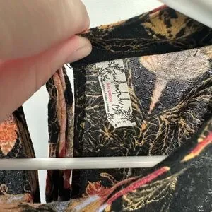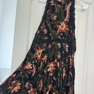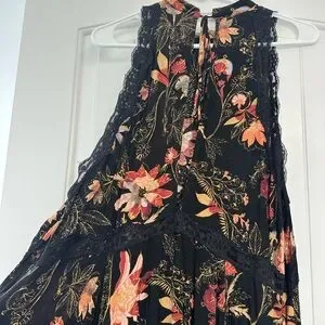 Chic black dress with colorful floral design. Features elegant lace trim. Ideal for stylish outings.