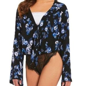 Free People Black Floral Bell Sleeve Bodysuit