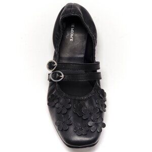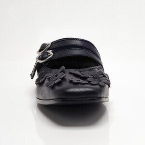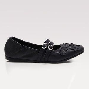 Chic black flats with floral design. Double strap detail. Perfect for casual wear.