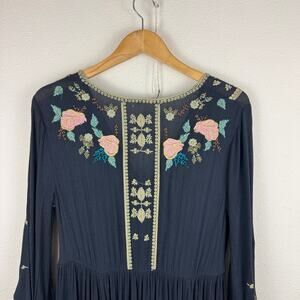 Elegant black midi dress with floral embroidery. Features long sleeves and a V-neckline. Perfect for any occasion.