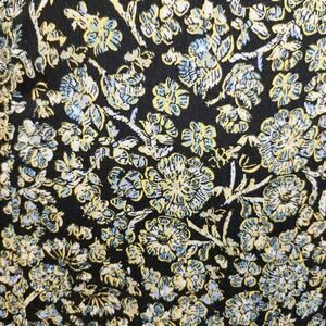 Chic and romantic, this Free People black combo mini dress features a vintage-inspired floral print in muted gold, blue, and ivory.