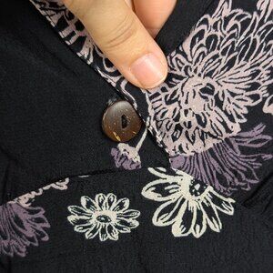 The bold floral pattern showcases cream, purple, and yellow blooms on a rich black background, making this piece stand out at garden parties, brunch dates, festivals, or casual summer gatherings.