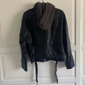 A cool staple for this season, this vegan leather moto jacket is featured in an effortless, drapey silhouette with a contrast detachable hood for a layered look.