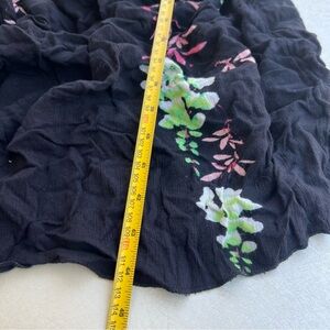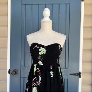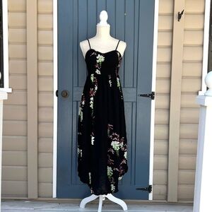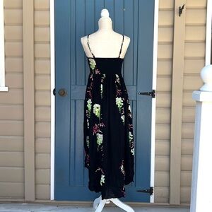 Chic black high low dress. Features colorful floral patterns. Ideal for stylish outings.