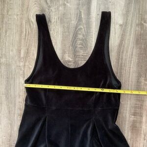 This chic black jumpsuit from Free People features a tank-style top with wide shoulder straps and a fitted bodice, offering a flattering silhouette. The gathered waist and wide-leg pants provide a relaxed and comfortable fit, perfect for any casual outing. Crafted from a soft velvet material, this one-piece design exudes elegance and style.