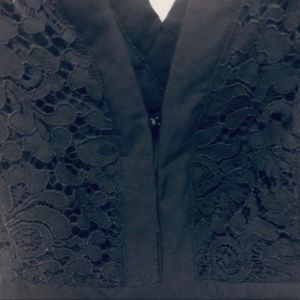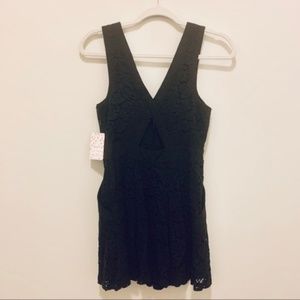 Beautiful and fun Free People Black Dress with lace design. V-neck double clasps in front. Back detailed with peep hole and V plunge design. HAS POCKETS. 🤩