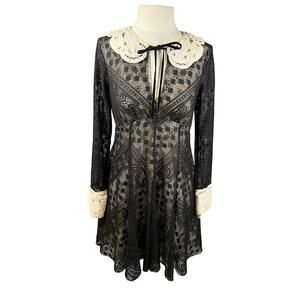 Super cute mini dress from Free People. Dramatic white lace collar and cuffs. Large keyhole opening at bust, closes with velvet bow. Hidden side zipper. Black lace over white lining. Retro 60's look. Excellent condition, size 2.