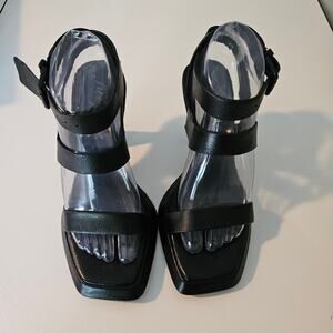 Free People Collection Black Candace Heels. Black leather heels with 3 straps. Adjustable ankle strap with buckle, square toe, flared heel. These are sleek and sexy shoes. They are part of Free People's line called FP Connection.