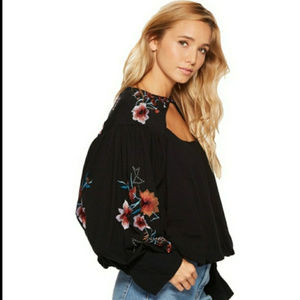 Free People Black Lita Top. New with tags. Size medium. Balloon hem. Beautiful embroidery. 67% cotton, 33% linen. Machine wash. Measures 19.5" pit to pit and 21.5" front shoulder to hem. Measurements are approximate. Suggested retail price $128.