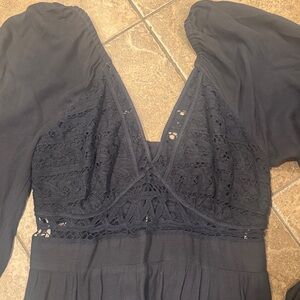 A free people Stunner!! Black lightweight, Elegant, maxi, long sleeve dress. Intricate detailing with cutouts for that perfect black dress to turn heads!! Perfect for any occasion. Worn twice only! Back of dress is just as pretty with stretch and button detail!