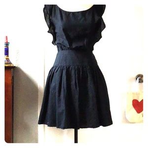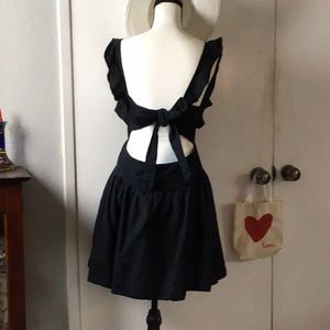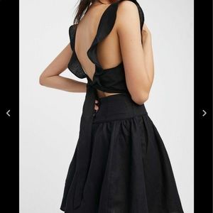 Elegant black midi dress by Free People. Features ruffled sleeves and open back with bow detail. Perfect for any occasion.