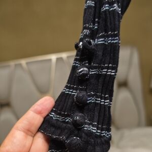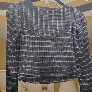 Chic black plaid blouse with deep V-neck. Features long sleeves and ruffle hem. Ideal for versatile styling.