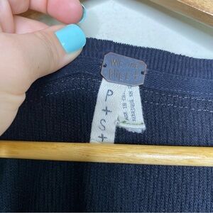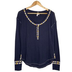 Free People Black Rainbow Thermal Waffle Knit Embroidered Henley Top Size Small