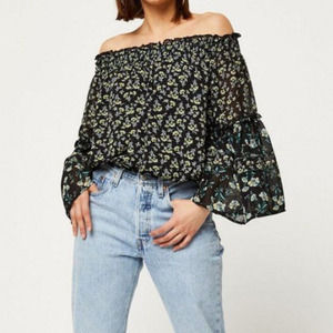 Free People Black Rose Valley Floral Off The Shoulder Cottagecore Peasant Blouse