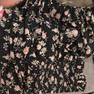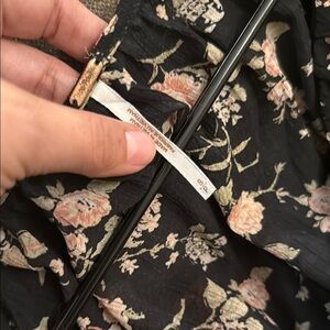 This chic black blouse by Free People showcases a ruched design and a cropped silhouette, perfect for a stylish look. The long sleeves and intricate floral pattern add a touch of elegance, making it a versatile addition to any wardrobe.
