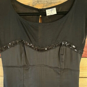 This is in good preowned condition showing normal wear and tear. It may have some small snags/pulls. This has no size label so please refer to measurements. It is a satin like material with pockets and side zip closure.