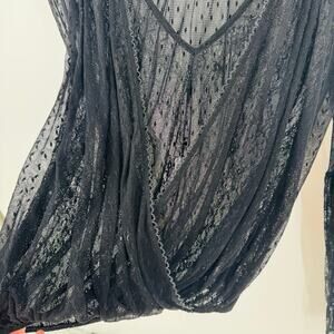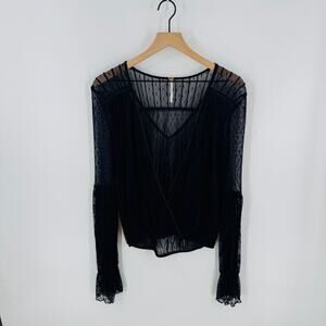Beautiful black sheer blouse from Free People, size Small. Features delicate Swiss dot mesh fabric, lace trim details, a deep V surplice neckline, and flowy sleeves with ruffled cuffs.