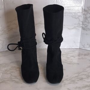 Elegant black suede booties. Features a stylish wrap detail. Perfect for any occasion.