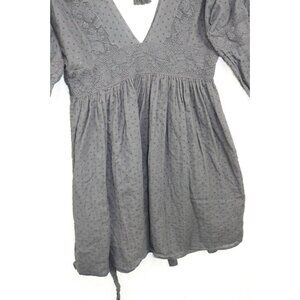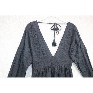This is a Free People Black Swiss Dot Long Sleeve Low V-Neck Mini Dress that is a size Medium. It ties at the neck in the back with tassels. It has an open back with another tie at the waist in the back. It is 100% Cotton. Laying flat, it measures: Armpit to armpit-18.5" and the Length is 32". It is in good condition.