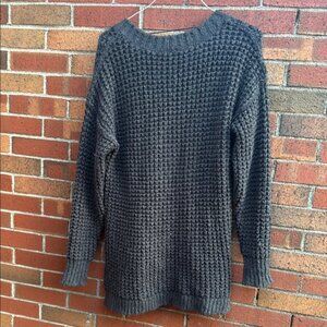 Embrace the cozy elegance of this Free People sweater, featuring a textured knit pattern and a relaxed V-neck design. The black color adds versatility, making it a perfect choice for layering and everyday wear. Its loose fit and asymmetrical hemline offer a modern touch to your wardrobe.
