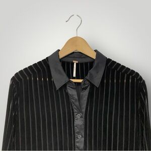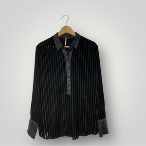 Elegant black velvet blouse. Features button-up front and long sleeves. Perfect for evening wear.
