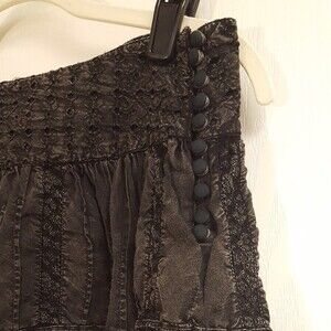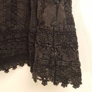 Material is a worn/washed black material with button detail on side by Free People. Different kinds of black lace add detail al over the skirt and hemline. size 4
