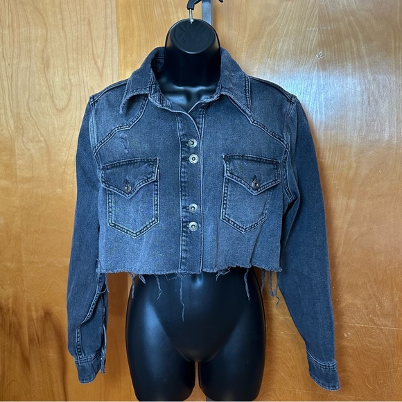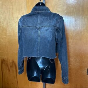distressed denim, cropped jacket, black wash, button-up, chest pockets, cuff buttons, casual outerwear, vintage-inspired, edgy style, versatile fit