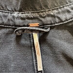 Free People purposefully distressed black-washed cropped denim jacket. Button up front with button chest pockets and buttons on the sleeve cuffs. She is in FANTASTIC condition!