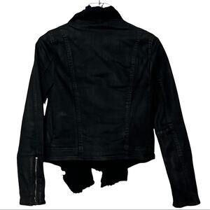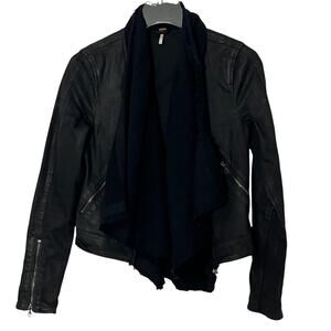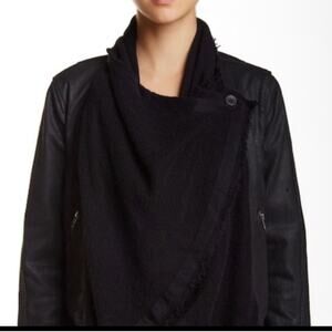 Free People black waxed denim with soft cotton drape front — can we buttoned for a more dramatic draping or just left down more like a scarf effect.