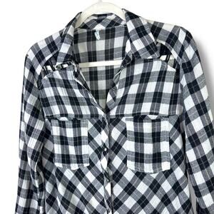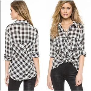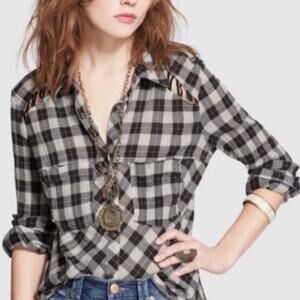 Free People Black White Plaid Lace-Up Cutout Snap Down Gauze Long Sleeve Shirt