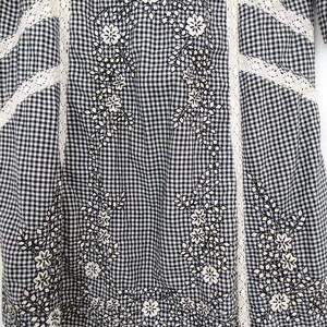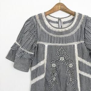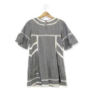 Free People Black & White Womens Sunny Day Shirt Dress. Short flutter sleeves, lace detail, Floral embroidery, Black and white gingham pattern, A-line oversized fit, 100% Cotton Machine wash.