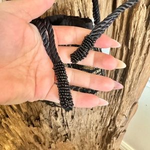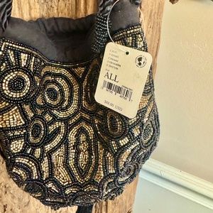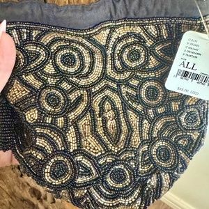 Elegant beaded design. Black and gold tones. Perfect for evening outings.