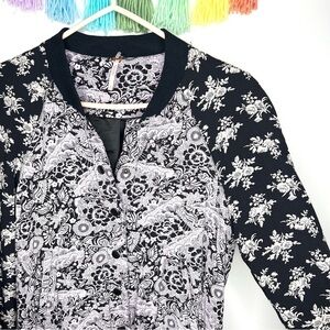 Free People Black and Purple Floral Snap Button Long Sleeve Bomber Jacket Small