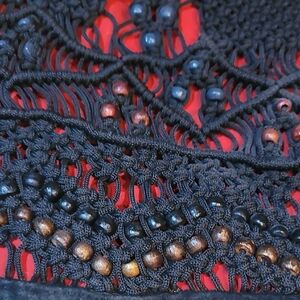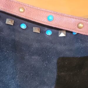AMAZING crocheted with beads and leather top stitching. Gold and turquoise studded accents. Leather: Black, red, and brown. ALL details in tact and excellent condition. Adjustable strap. 15" x 16"