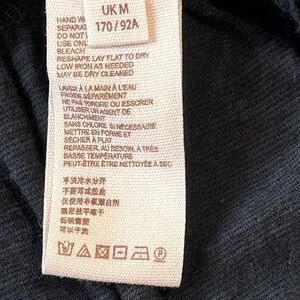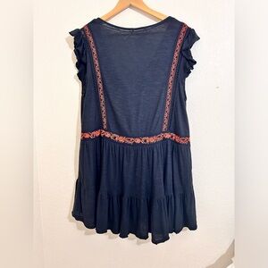 Chic black mini dress with red embroidery. Features ruffled sleeves and a flared hem. Perfect for casual outings. Has a little wear around the neck