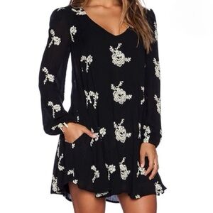 Chic black dress with white floral design. Long sleeves and unique back detail. Perfect for versatile styling.