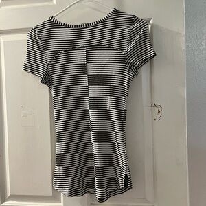 Stylish striped top. Features a deep V-neck. Short sleeves. Perfect for casual wear. EUC