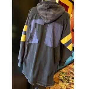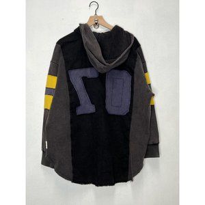 Stylish mixed media rugby of woven and knit cotton. Features bold black and yellow design. Comfortable and trendy. Metal buttons at placket. Shirt collar and hoodie. Oversized fit. Excellent used condition.