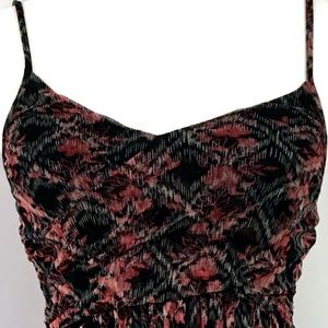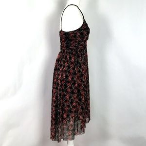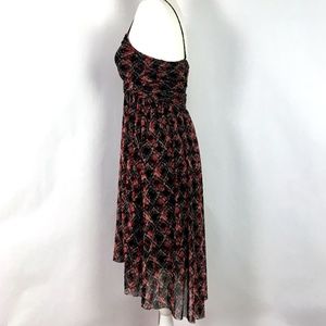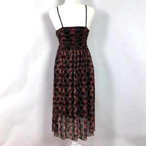 Free People Black/Red Floral Diamond Print Overlay Sleeveless Dress. Size XS. Faux crossover bodice with gathered look. Spaghetti straps. Hi/low hem. Waist and sides of top have elastic so has some stretch.