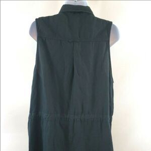 This Free People sleeveless tunic in black is a must-have for any woman's wardrobe. The snap front closure and collared neckline add a touch of sophistication to its casual design. The tunic features pockets and a cinched waist that flatters any body type. Ideal for a casual occasion, this tunic is made of a solid pattern and is perfect for any season. It is available in size S and is a regular fit. Add this versatile tunic to your collection today. Style #OB520799 MSRP $128