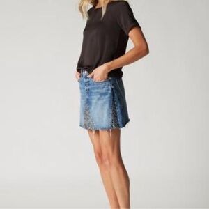 BLANKNYC Way Back When cutoff denim mini skirt sold at Free People. Has studded embellishments in a triangle shaped front and sides. Zip fly with button closure. High rise.