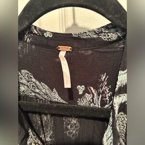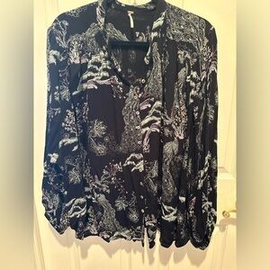 Free People blouse featuring a peacock print. Button-down style with an oversized fit and semi-sheer fabric.