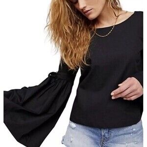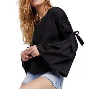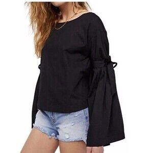 Free People Blouse Small Black So Obviously Yours Bell Sleeve Bow Button Back