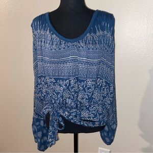 Chic bohemian blouse with intricate patterns. Flowy sleeves and tie detail. Ideal for casual wear.