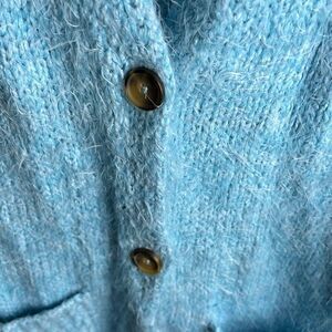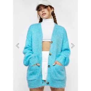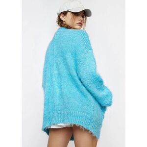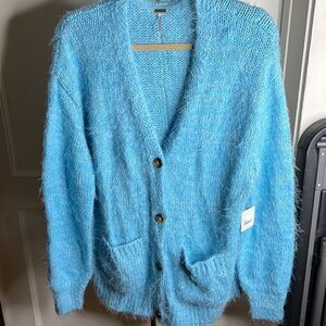 Free People Blue Butterfly Nevermind Cardigan cuz you donât wanna be bothered. This soft and fuzzy knit cardigan has an oversized fit, pockets on the front, and button closures.