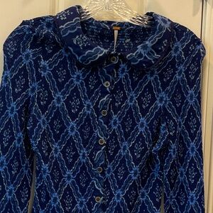Free People Blue Smocked Front Button Down Woman’s Top / Cardi is New without tag, ( seen in pictures only tag with extra buttons attached) Featuring a Smocked style, Collard neckline, and lettuce trim.