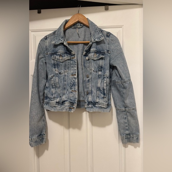 Chic blue denim jacket. Features classic stitching and branded tag.